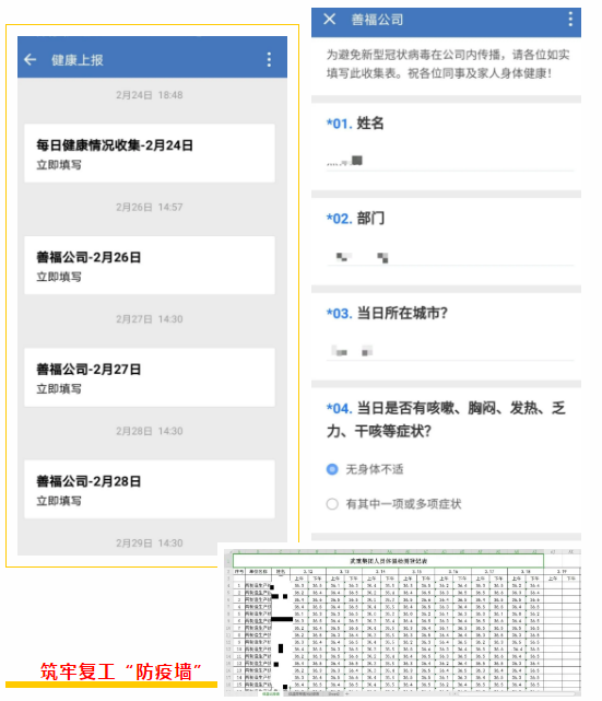 “復工任務雖急,人員安全更重,必須把好人員進場第一關(guān)?!痹谌藛T進場管控上,武重集團建立了這樣一條“硬核規(guī)定”:員工必須每天通過企業(yè)微信提交體溫信息,建立員工健康檔案,筑牢復工“防疫墻”。