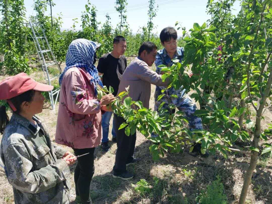 王躍(右一)指導(dǎo)村集體經(jīng)濟果園工人稀果