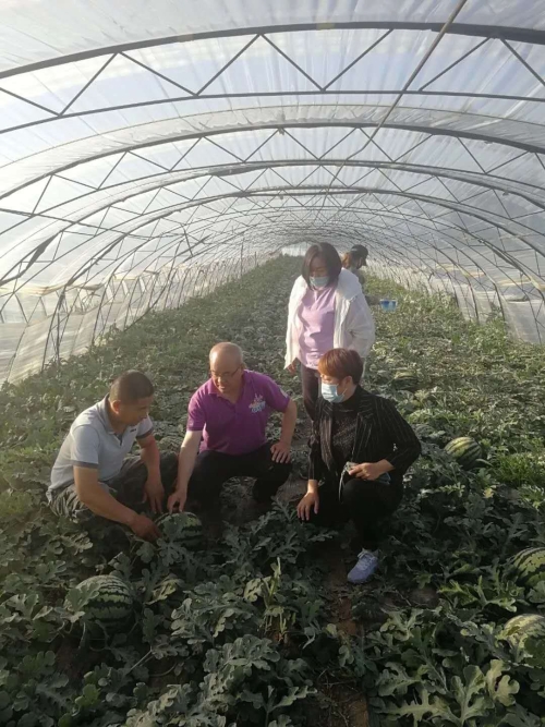原秀樓(前中)指導(dǎo)村民大棚西瓜管理