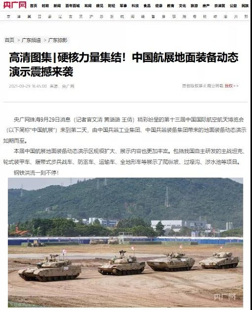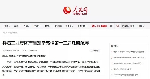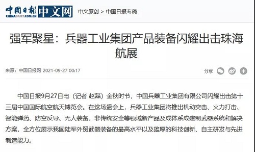《珠海特區(qū)報(bào)》:中國(guó)兵器工業(yè)集團(tuán)攜153項(xiàng)產(chǎn)品參展全方位展示我國(guó)陸軍外貿(mào)武器裝備最高水平2021-09-30
