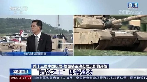 央視《新聞聯(lián)播》報(bào)道第十三屆中國(guó)航展,著重介紹了VT4主戰(zhàn)坦克,關(guān)注航展公眾日中國(guó)兵器館情況。9月28日下午央視《新聞直播間》航展特別節(jié)目《藍(lán)天盛會(huì)》邀請(qǐng)集團(tuán)公司訪談嘉賓做客直播間對(duì)中國(guó)兵器館兵器工業(yè)集團(tuán)展區(qū)等進(jìn)行1小時(shí)直播;9月28日下午、10月2日下午分別對(duì)地面裝備動(dòng)態(tài)表演進(jìn)行兩場(chǎng)直播。央視《朝聞天下》、《新聞直播間》、《共同關(guān)注》、《天下財(cái)經(jīng)》、《軍事報(bào)道》、《正午國(guó)防軍事》、《軍武零距離》等相繼推出集團(tuán)公司參展裝備的報(bào)道。