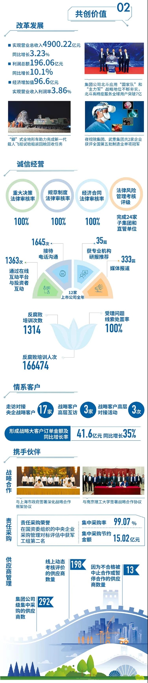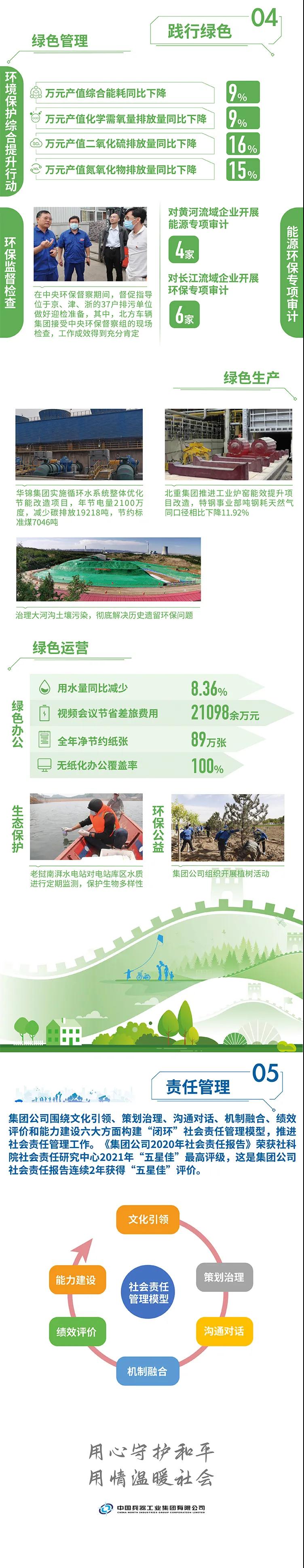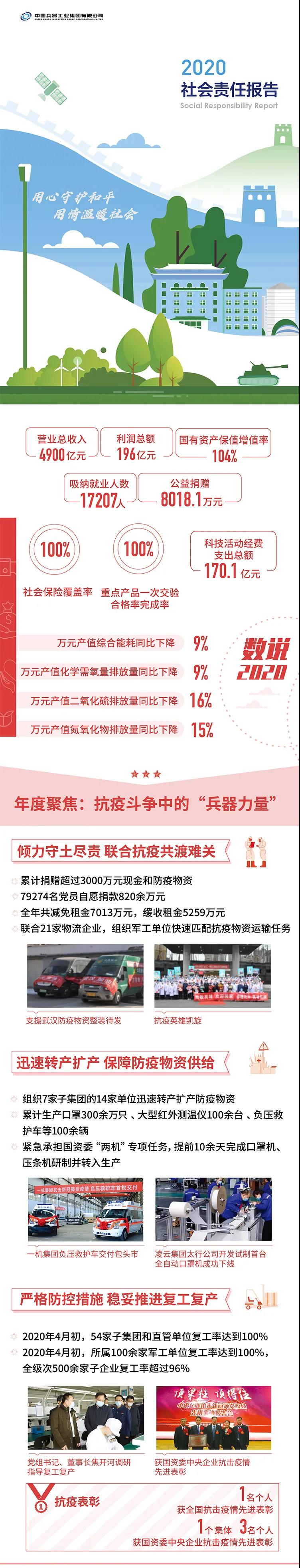 2020年,是“十三五”規(guī)劃收官之年,也是全面建成小康社會、實現(xiàn)第一個百年目標的決勝之年。集團公司黨組書記、董事長焦開河在報告開篇指出,集團公司實現(xiàn)了“十三五”圓滿收官,整體步入了高質量發(fā)展軌道,呈現(xiàn)出基礎更牢、動力更強、空間更大、效能更高的積極向上良好態(tài)勢。在“十三五”特別是近三年來的工作實踐中,我們明確了“集團公司是國家安全和國防建設的脊梁、是國家戰(zhàn)略科技力量最為重要的組成部分、是黨和國家最可信賴的‘六個力量’,肩負著支撐國防軍隊建設、推動科技自立自強、服務構建新發(fā)展格局的重大政治責任和光榮使命,具有極強的政治屬性,性質特殊、使命特殊、責任特殊”的新時代新階段職責使命,深化了對“堅持以習近平新時代中國特色社會主義思想定向領航,是集團公司高質量發(fā)展的根本遵循;保持貫徹落實習近平總書記重要指示批示和黨中央決策部署的戰(zhàn)略定力,是集團公司高質量發(fā)展的根本前提;履行好強軍這個首要職責,是集團公司高質量發(fā)展的根本要求;加快兵器科技創(chuàng)新突破,是集團公司高質量發(fā)展的根本支撐;加強黨的領導黨的建設,是集團公司高質量發(fā)展的根本保證”的兵器工業(yè)改革發(fā)展規(guī)律認識。 《報告》聚焦“抗疫斗爭中的‘兵器力量’”,生動展示了集團公司抗擊疫情的有力行動,展現(xiàn)了集中力量辦大事、急國家之所急的“兵器速度”,彰顯了“把一切獻給黨”的人民兵工精神和貫徹落實國家決策部署的責任擔當。《報告》以“用心守候和平、用情溫暖社會”為主題,從恪守本責、共創(chuàng)價值、致力和諧、踐行綠色、責任管理五個維度,全面展現(xiàn)集團公司在堅持履行政治責任、經(jīng)濟責任、社會責任,履行強軍首責、加強黨的建設、打造國家戰(zhàn)略科技力量、推進“一帶一路”倡議、打好打贏三大攻堅戰(zhàn)、深化改革、助力員工成長、支持社會公益事業(yè)、提升社會責任管理等方面的生動實踐和履責亮點,凸顯集團公司保持貫徹落實黨中央決策部署的戰(zhàn)略定力、在聚焦主責主業(yè)、科技引領、國際化經(jīng)營上持續(xù)用力,為實現(xiàn)第一個百年奮斗目標貢獻力量的初心與行動?!秷蟾妗吩俅潍@得中國企業(yè)社會責任報告評級專家委員會“五星佳”最高評級,兵器工業(yè)集團成為軍工行業(yè)唯一連續(xù)10年獲得最高評級的企業(yè)。 2021年是開啟新征程的開局之年,也是建黨100周年、人民兵工創(chuàng)建90周年,兵器工業(yè)集團將全面貫徹落實黨中央戰(zhàn)略部署,緊扣推動高質量發(fā)展主題,圍繞“十四五”開好局、起好步,堅決完成黨中央賦予的職責使命,履行好中央企業(yè)和軍工集團的政治責任、經(jīng)濟責任、社會責任,為實現(xiàn)中國夢強軍夢作出新的更大貢獻! 一圖看懂《中國兵器工業(yè)集團有限公司2020年社會責任報告》