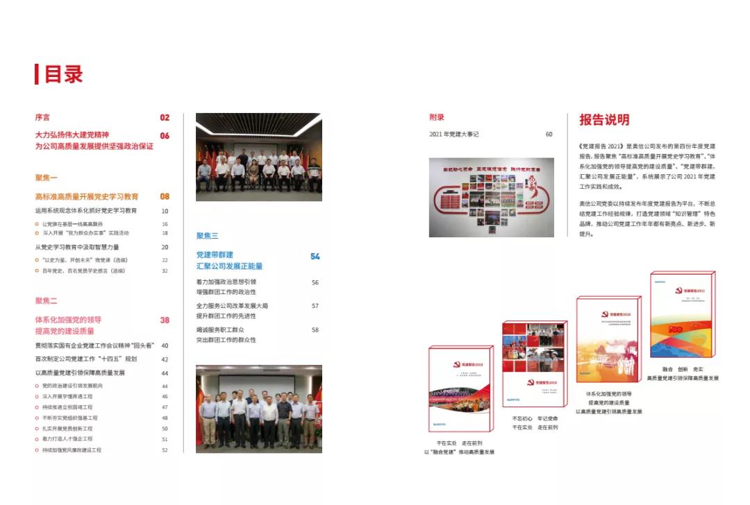作為奧信公司黨建工作創(chuàng)新成果,《黨建報告2021》聚焦 “高標(biāo)準(zhǔn)高質(zhì)量開展黨史學(xué)習(xí)教育”、“體系化加強(qiáng)黨的領(lǐng)導(dǎo)提高黨的建設(shè)質(zhì)量”、“黨建帶群建,匯聚公司發(fā)展正能量”,全面展示了公司2021年黨建工作實踐與成效。報告既是奧信公司黨委和16個黨支部、102名共產(chǎn)黨員向上級黨組織交出的一份黨建工作答卷,也是弘揚偉大建黨精神,奮力走好新時代“趕考之路”,以高質(zhì)量黨建引領(lǐng)保障高質(zhì)量發(fā)展,不斷推動企業(yè)做強(qiáng)做優(yōu)做大的動員令。