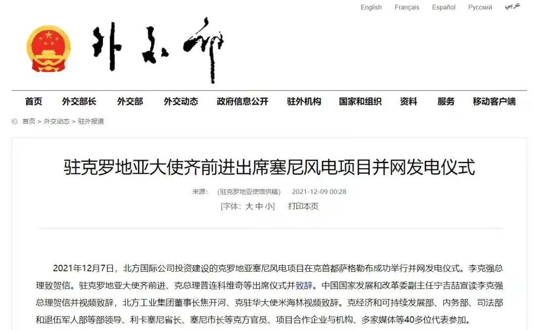 2021年12月7日,中國兵器工業(yè)集團有限公司北方公司所屬北方國際投資、建設和運營的塞尼156MW風電項目在克羅地亞首都薩格勒布隆重舉行并網(wǎng)發(fā)電儀式。李克強總理致賀信。克羅地亞總理安德烈·普連科維奇,中國駐克羅地亞大使齊前進出席儀式并致辭。中國國家發(fā)展和改革委員會副主任寧吉喆宣讀李克強總理賀信并視頻致辭,中國兵器工業(yè)集團有限公司董事長焦開河、克駐華大使米海林視頻致辭。 中華人民共和國外交部報道 普連科維奇總理在致辭中表示,感謝李克強總理發(fā)來賀信,他與中國領導人一直非常重視塞尼風電項目投資與建設。祝賀項目克服疫情與地震等影響,成功并網(wǎng)發(fā)電。增加清潔可再生能源、綠色電力對克乃至歐洲都很重要,克政府的重要戰(zhàn)略和目標之一就是低碳發(fā)展和增加清潔能源供應。塞尼風電項目占克總發(fā)電量將達3.5%,對克實現(xiàn)2022年可再生能源比例30%目標具有很大幫助。此次投資使北方國際成為在克最大的清潔能源投資企業(yè)。非常歡迎更多中國企業(yè)擴大對克投資。 寧吉喆宣讀李克強總理賀信并視頻致辭時表示,2017年11月第六次中國—中東歐國家領導人會晤期間,在李克強總理和普連科維奇總理等中東歐16國領導人的共同見證下,塞尼項目簽署了協(xié)議。項目既是中國堅定踐行綠色發(fā)展理念的具體體現(xiàn),也是中國深化與克羅地亞、與中東歐國家務實合作的生動實踐。希望中克兩國政府部門,企業(yè)等有關各方共同努力、相互配合,運營好塞尼項目,打造出中歐綠色合作的樣板,帶動兩國務實合作持續(xù)深入發(fā)展,造福兩國人民。 焦開河在致辭時表示,在塞尼項目投入運營之際,李克強總理專門致信祝賀。作為塞尼項目的投資方、建設方、運營方,我們備受鼓舞,深感自豪!未來,中國兵器工業(yè)集團有限公司將繼續(xù)深入貫徹落實習近平總書記重要指示批示精神和李克強總理賀信重要要求,以高標準、可持續(xù)、惠民生為目標,與克方合作伙伴坦誠溝通、攜手并進,進一步推動綠色能源建設,努力打造更多的“一帶一路”標志性、引領性、示范性項目,為鞏固中克戰(zhàn)略合作伙伴關系、推進中克從經(jīng)貿(mào)領域到全方位合作貢獻積極力量。 齊前進祝賀塞尼風電項目順利完工和成功并網(wǎng)發(fā)電。他表示,塞尼風電站項目并網(wǎng)發(fā)電是中克兩國領導人親自關注和推動的成果。作為迄今最大的中國在克投資合作項目,塞尼風電項目是中克和中歐綠色合作的典范,對克提高清潔能源生產(chǎn)消費發(fā)揮著重要作用。項目建設過程中為當?shù)嘏囵B(yǎng)了許多工程、技術和管理人才,帶動了當?shù)仄髽I(yè)發(fā)展,增加了就業(yè)和稅收,促進了當?shù)亟?jīng)濟社會發(fā)展,充分體現(xiàn)了中國對外經(jīng)貿(mào)合作與“一帶一路”倡議秉持的互利共贏、共同發(fā)展的理念,也是中國積極倡導的綠色低碳發(fā)展合作的典范。 塞尼項目位于克羅地亞中部亞得利亞海沿岸,建設總投資1.79億歐元,總裝機容量156MW,采用39臺4MW風力發(fā)電機組設備,風場面積達42.8平方公里。項目正式運營后,預計每年平均發(fā)電超3000小時,貢獻約5.3億度綠色電力,可減少二氧化碳排放約46萬噸,將為克羅地亞促進能源轉(zhuǎn)型、發(fā)展綠色經(jīng)濟提供強勁助力,貢獻了“中國智慧”“中國方案”。 來源/中華人民共和國外交部、綜合有關報道 |
