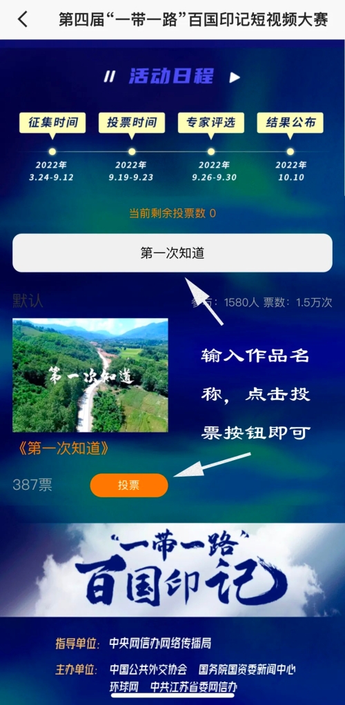 9月19日,由中央網(wǎng)信辦網(wǎng)絡(luò)傳播局指導(dǎo),中國(guó)公共外交協(xié)會(huì)、國(guó)務(wù)院國(guó)資委新聞中心、環(huán)球網(wǎng)和中共江蘇省委網(wǎng)信辦聯(lián)合主辦的第四屆“一帶一路”百國(guó)印記短視頻大賽完成作品征集,正式開(kāi)啟投票階段。