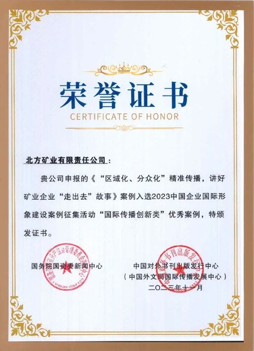 論壇上,“2023中國(guó)企業(yè)國(guó)際形象建設(shè)案例征集活動(dòng)”評(píng)選結(jié)果揭曉。評(píng)選活動(dòng)以“挖掘典型案例、建設(shè)企業(yè)形象、講好中國(guó)故事”為宗旨,從來(lái)自中央企業(yè)、地方國(guó)企及民營(yíng)企業(yè)報(bào)送的251個(gè)有效案例中遴選出“共建新絲路”“跨文化融合”“國(guó)際傳播創(chuàng)新”“筑夢(mèng)人物故事”四類專項(xiàng)優(yōu)秀案例共40個(gè)。中國(guó)兵器工業(yè)集團(tuán)北方公司北方礦業(yè)有限責(zé)任公司案例《“區(qū)域化、分眾化”精準(zhǔn)傳播,講好礦業(yè)企業(yè)“走出去”故事》入選“國(guó)際傳播創(chuàng)新類”優(yōu)秀案例。