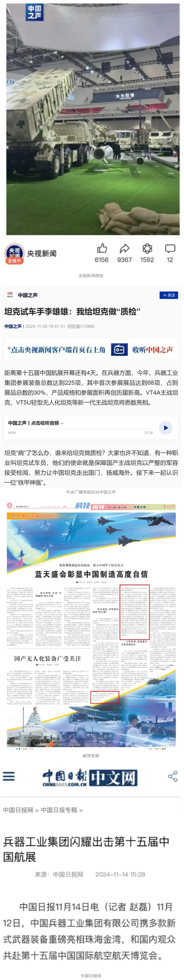 11月13日央視新聞《藍(lán)天之約》直播地面裝備動態(tài)演示此次航展,央視綜合頻道《新聞聯(lián)播》《晚間新聞》、新聞頻道《新聞直播間》《新聞30分》《朝聞天下》《共同關(guān)注》《東方時空》《午夜新聞》、財經(jīng)頻道《天下財經(jīng)》《經(jīng)濟(jì)信息聯(lián)播》《正點(diǎn)財經(jīng)》《第一時間》、中文國際頻道《今日環(huán)球》《中國新聞》、國防軍事頻道《軍事報道》《正午國防軍事》《國防軍事早報》《軍迷行天下》等欄目共播出兵器工業(yè)集團(tuán)參展相關(guān)新聞報道40余條。11月10日央視新聞頻道《新聞30分》11月10日央視中文國際頻道《中國新聞》11月10日央視國防軍事頻道《軍事報道》11月11日央視國防軍事頻道《正午國防軍事》