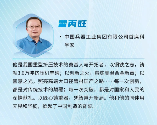 近日,《科學(xué)中國(guó)人》雜志社發(fā)布2024“年度科技人物”榜單,中國(guó)兵器首席科學(xué)家、北重集團(tuán)雷丙旺當(dāng)選“影響力科學(xué)家”。 雷丙旺是我國(guó)極端金屬擠壓技術(shù)的開拓者,扎根邊疆地區(qū)國(guó)防特大型企業(yè)工作38年,長(zhǎng)期從事金屬成形制造裝備與工藝研究工作。他研制出我國(guó)極限制造的大國(guó)重器——3.6萬(wàn)噸黑色金屬垂直擠壓機(jī),一舉打破國(guó)外技術(shù)封鎖,填補(bǔ)國(guó)內(nèi)空白,實(shí)現(xiàn)了超(超)臨界電站核心管道和航空發(fā)動(dòng)機(jī)高壓渦輪盤粉末合金棒材的中國(guó)制造,開發(fā)出成套關(guān)鍵技術(shù),取得一系列原創(chuàng)性成果,促進(jìn)了產(chǎn)業(yè)的融合發(fā)展,創(chuàng)造巨大經(jīng)濟(jì)社會(huì)效益。