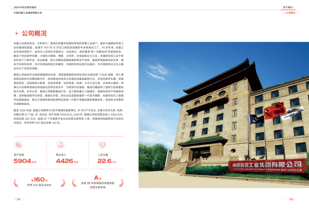 近日,中國兵器工業(yè)集團有限公司正式發(fā)布《中國兵器工業(yè)集團有限公司2024年度社會責任報告》。本次報告是集團公司第16份年度社會責任報告,從堅守強軍首責、服務經(jīng)濟建設、共創(chuàng)美好生活三個維度,全面展示集團公司履行社會責任的實踐與成效。經(jīng)中國企業(yè)社會責任報告評級專家委員會評定,《報告》獲得“五星佳”最高評級,成為軍工行業(yè)唯一一家連續(xù)6年獲此殊榮的中央企業(yè)。 兵器工業(yè)集團2024年度社會責任報告 部分內(nèi)容摘錄 ↓↓↓ 文/社會責任部 |